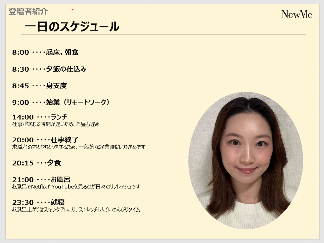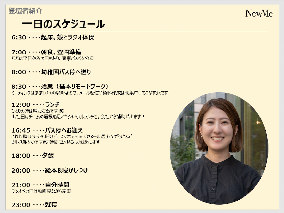 そして再び転職しNewMeへの入社を決めました。今回の転職は、少し前に子どもを産んだという経験も影響しています。自分のキャリア人生を、新卒・転職後・今と区切り、これからは第三章のイメージ。これからどうしていこうと考えた時に、今の会社に復職した後の自分が大体イメージできてしまうことに気が付きました。周りにもママさんがたくさんいたので、良くも悪くも働いている自分が想像できてしまって。正直に自分と向き合った結果、働きやすいだろうし安定はしているものの、このままではあまりワクワクしないと思ってしまって。その時にNewMeに出会い、NewMeのビジョンでもある(人生を)ハンドリングできるかと自分に問い直した時に、このままでは自分もハンドリングできないと感じ、動こうと思いました。スタートアップという今まで経験のない環境ですが、モチベーションがしっかりあった方が仕事と子育てをより楽しく両立できると思い転職することにしました!