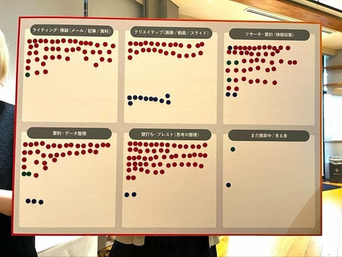 本セッションに先立ち、株式会社MIXIは当日来場者を対象にAI利用状況の簡易アンケートを実施。入場時にMIXIのブースにて用途別にシールを貼ってもらう形式で、リアルタイムにAI活用状況を可視化した。