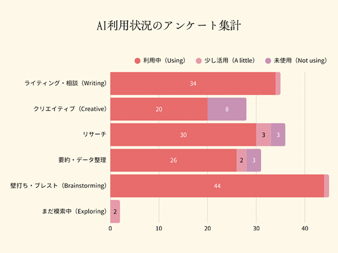 その結果、「壁打ち・ブレスト」「リサーチ」「ライティング」などの用途では既に多くの参加者が日常的にAIを活用していることが明らかになった。特にライティング領域では45名中44名が「活用中」と回答し、思考整理(36名中34名)、リサーチ(36名中30名)と続く結果となり、業務の中核部分にAIが組み込まれている実態がうかがえる。