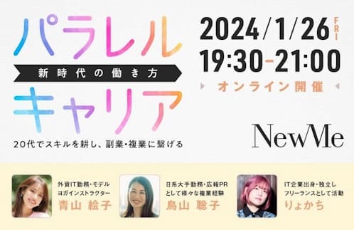 NewMeでは女性×キャリアを共通テーマとしながら、多様な働き方・生き方を届けていくことを目的に様々なイベントを開催しております。 今回は、パラレルキャリアに関するオンラインセミナーを開催しました。 20代で本業としっかり向き合い努力を重ねた結果、出会った副業や複業。好きな仕事に自分らしく取り組みながら、成長できる新しいキャリアとして「パラレルキャリア」が、今注目されています。メディアやSNSでは見かけるけれど、周りには参考となるロールモデルがいない…どうやってパラレルキャリアを実現することができるようになるのか?そんな思いを抱える方も多いのではないでしょうか。 現在、パラレルキャリアを実現し、活躍されているゲストの皆さんをゲストにお呼びして、これまでどのようなキャリアを歩まれてきたのか、リアルな等身大のお話を伺いました。