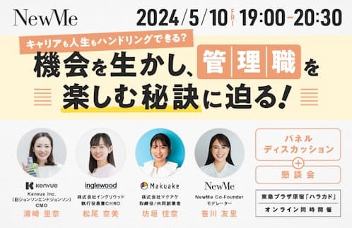 NewMeでは女性×キャリアを共通テーマとしながら、多様な働き方・生き方を届けていくことを目的に様々なイベントを開催しております。 今回は、Kenvue Inc.(旧:ジョンソンエンドジョンソン)、株式会社イングリウッド、株式会社マクアケで管理職として活躍する3名のゲストをお招きして「機会を生かし、管理職を楽しむ秘訣に迫る!」というテーマで東急プラザ原宿「ハラカド」を会場に、セミナーを開催しました。