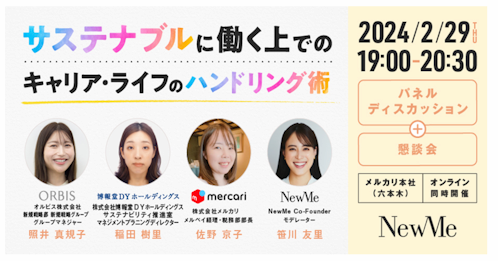 NewMeでは女性×キャリアを共通テーマとしながら、多様な働き方・生き方を届けていくことを目的に様々なイベントを開催しております。今回は、オルビス株式会社、株式会社博報堂DYホールディングス、株式会社メルカリで活躍する女性社員の方々をお招きして【サステナブルに働く上でのキャリア・ライフのハンドリング術】というテーマで株式会社メルカリのオフィスを会場に、NewMe主催セミナーを開催しました。