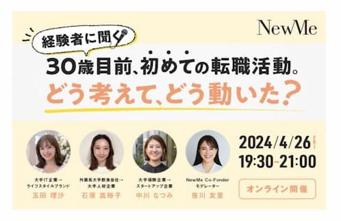 NewMeでは女性×キャリアを共通テーマとしながら、多様な働き方・生き方を届けていくことを目的に様々なイベントを開催しております。今回は30歳を目前に転職を検討し、実際に新しい環境へ飛び込み、活躍されている3名のゲストをお呼びして「経験者に聞く!30歳目前の転職活動。どう考えて、どう動いた?」というテーマでオンラインセミナーを開催しました。