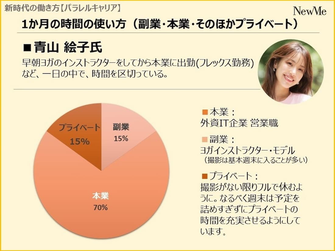 青山:時間の使い方(1日の中の時間配分)は変わりました。私の場合はヨガのお仕事が朝の7時、8時と早い時間から始まるので、前の日は絶対に夜家にいる、何時までに寝る、など自分の中でルールを決めています。副業をやりすぎて疲れてきたときは、内容を考え直すようにしています。あくまでも本業が最優先という形で支障が出ないように見直すようにしています。
