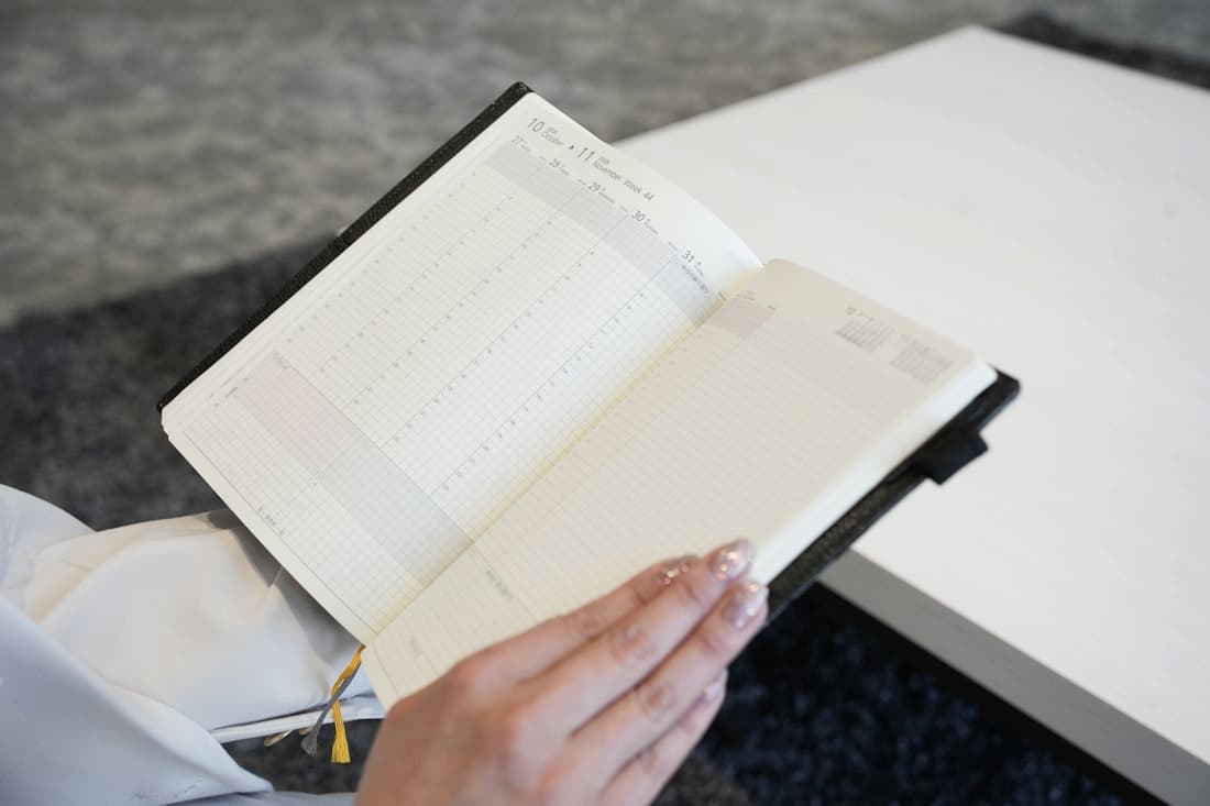 ライフプランナーという自由度の高い仕事だからこそ、自己管理がとても重要になります。自分でスケジュールを埋めていかないと、時間を持て余すことにもなってしまいます。バーチカルの手帳は1日の時間軸が縦に配置されており、時間毎の予定がわかりやすいため、予定のない隙間時間があれば、テレアポを入れるなど1週間単位で予定を管理しています。また、ToDoリストだけでなく、その日の感情や気づき、目標なども手帳に書き留めるようにしています。デジタルツールも便利ですが、あえて紙に書くことで脳が活性化されて、運気が上がると聞いたことがあるので、私の拘りです!