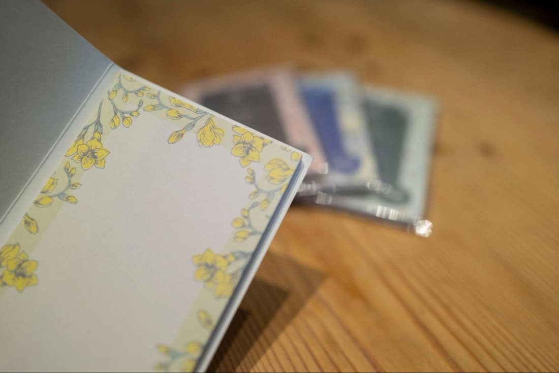 日比谷花壇の付箋です。メールやデータでなく、取引先の官公庁とのやりとりなどは今も紙の書類を送付することも多いので、一言添える際に土木田商会でも扱っている日比谷花壇の付箋が重宝しています。請書などお堅い書類も少しでも華やかで柔らかい雰囲気になればいいなと。